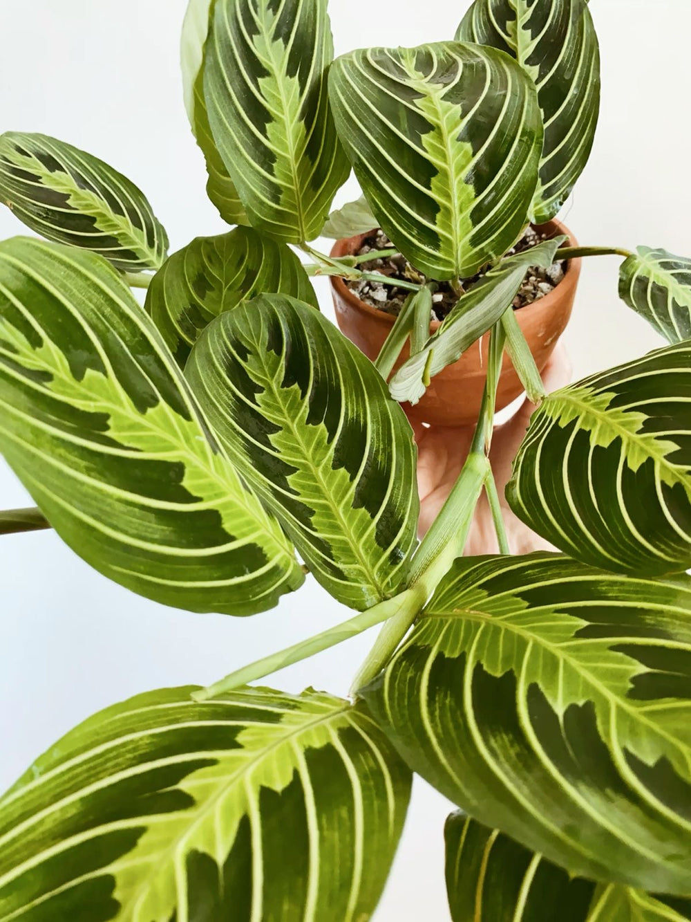 The Prayer Plant (Maranta) is a stunning indoor plant known for its unique patterned leaves and its special daily movement. The leaves fold upward at night—just like hands in prayer—giving the plant its beautiful name.