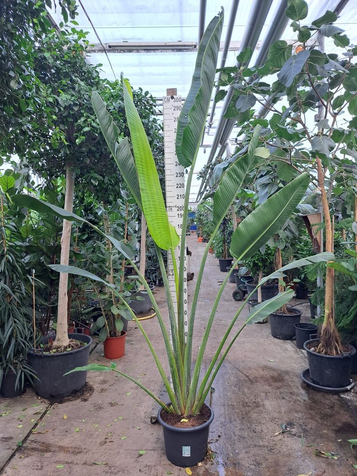 Leaves: Large, banana-like leaves arranged in a single vertical fan shape, creating a dramatic architectural effect.