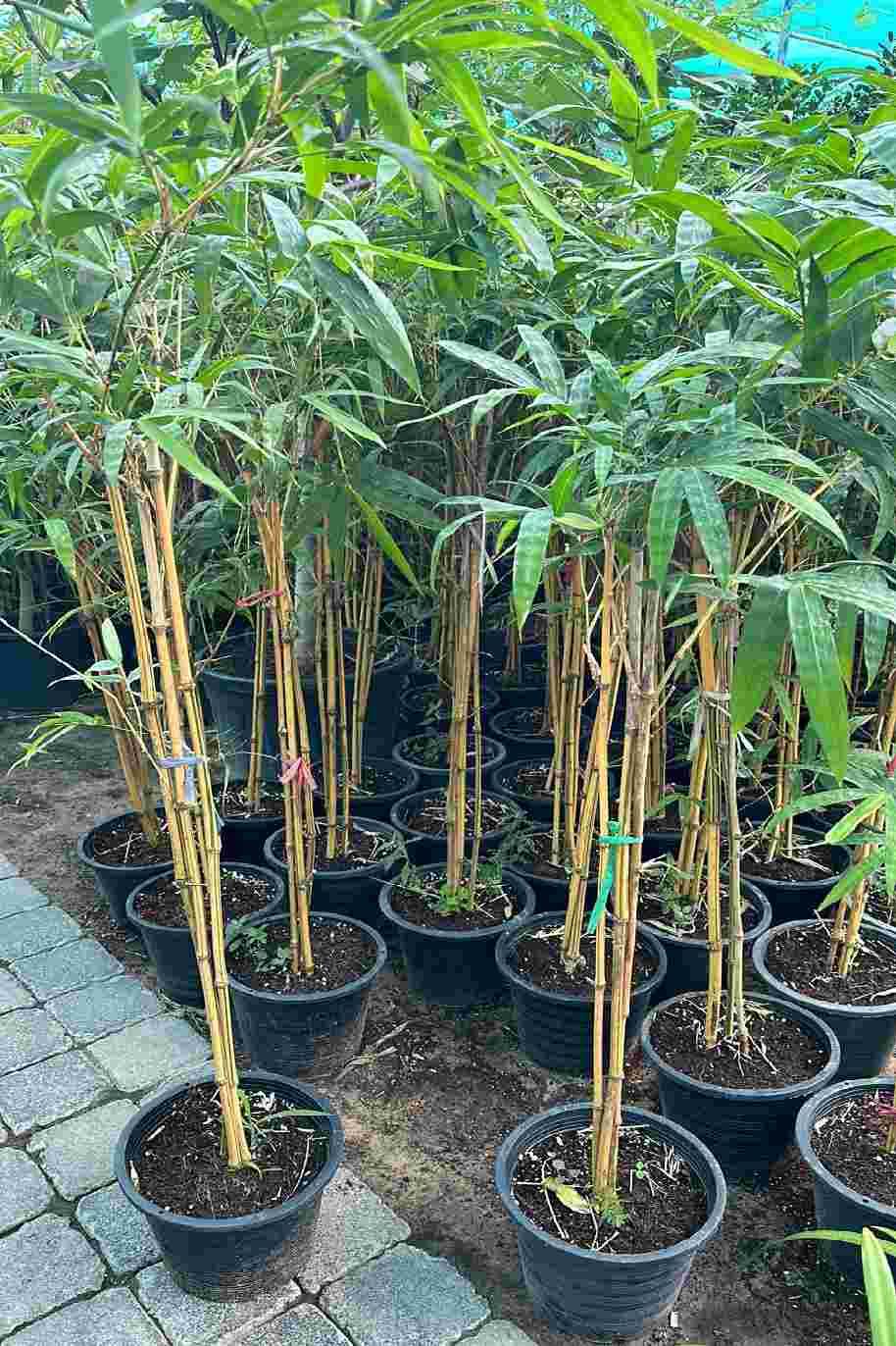 Bambusa vulgaris, commonly known as Yellow Bamboo, is one of the most widely grown bamboo species in the world. It is a large, clumping bamboo with bright golden-yellow culms (stems) and green stripes, adding a bold tropical look to landscapes. Mature clumps typically grow 10–20 meters tall with culm diameters of 4–10 cm.